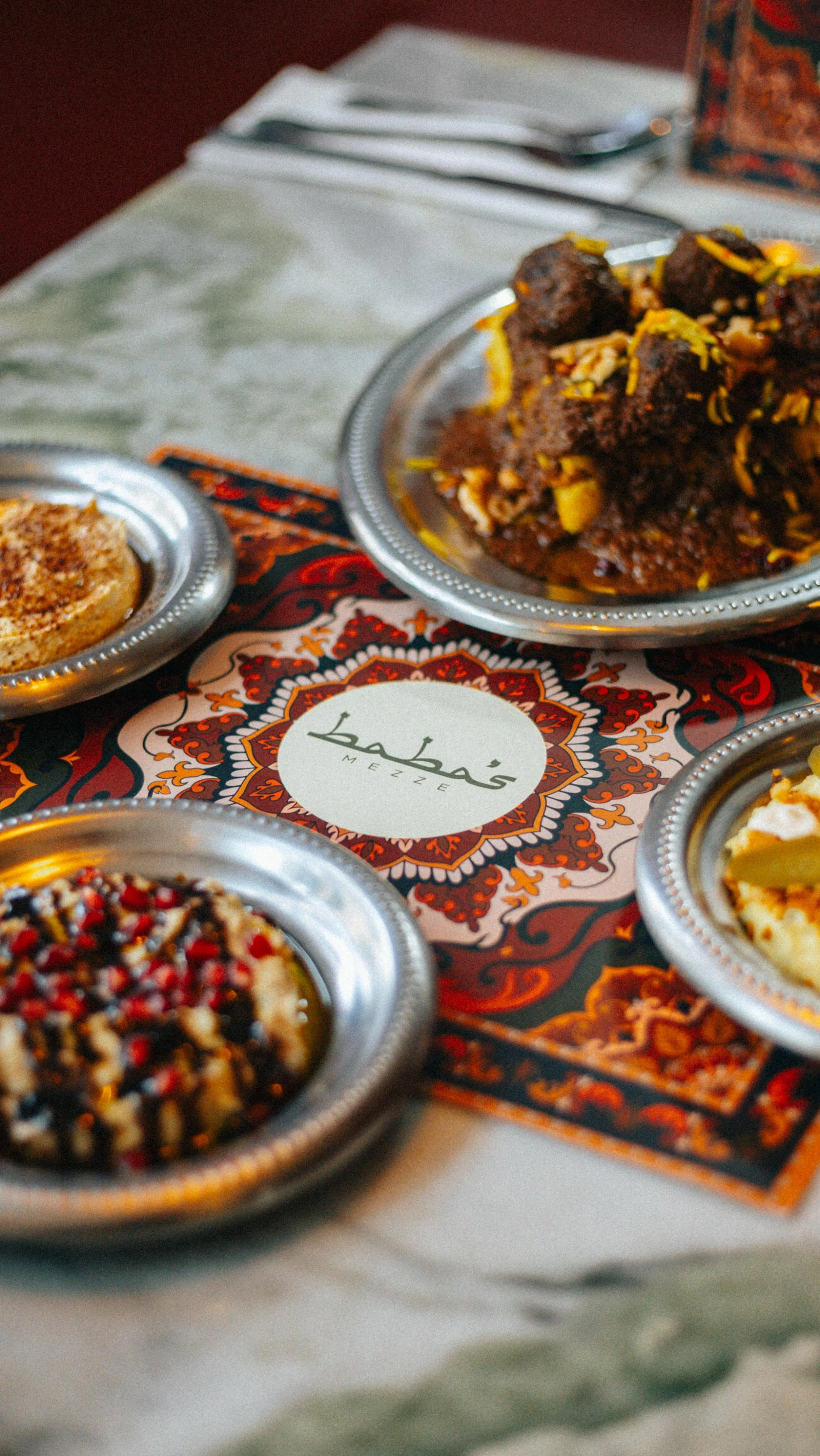 A selection of authentic Persian Mezze dishes served on elegant metal plates at Baba's Mezze, including creamy hummus with black truffle Olivieh, vibrant dips, and crispy felafel. Freshly baked bread and a refreshing Baba's sprits.